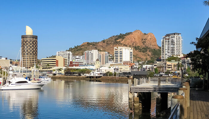 Castle Hill is part of the Townsville skyline. Pictured here, with a view from the waterfront looking back to the hill, Castle Hill is near the centre of town.